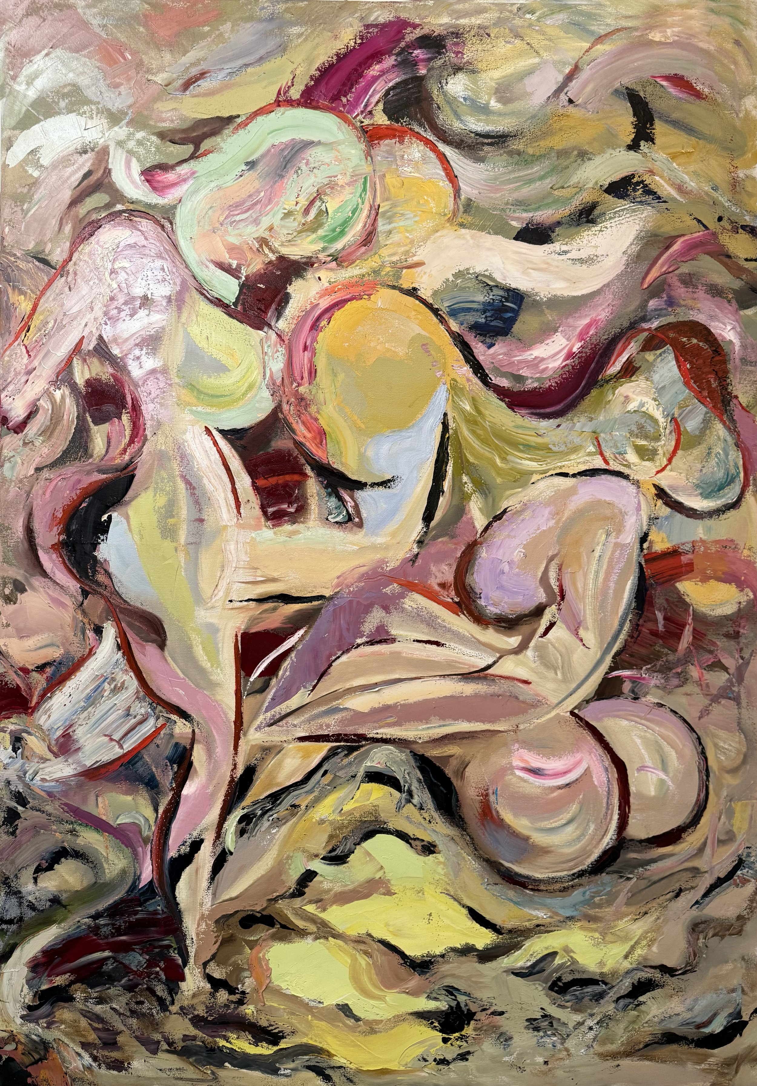 My work begins with my own body, turning it into ever-growing shapes and colors that overlap and interweave to build a space of my own. This process dissolves the external gaze while also becoming an act of inner self-protection.