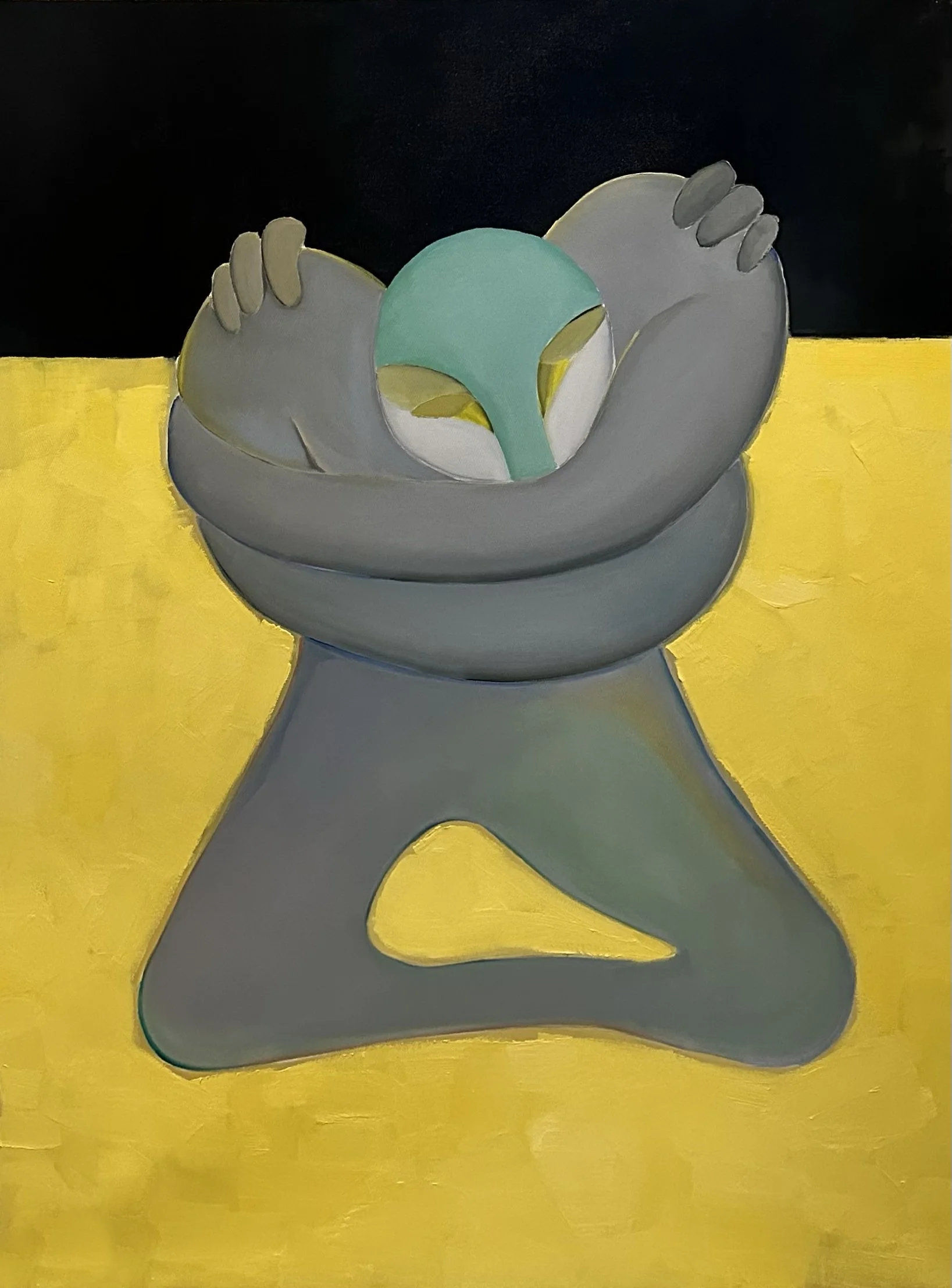 In this painting, I depict the universal condition faced by soldiers after war. The figure is curled up with arms wrapped around the body, forming a posture of self-defense. This conveys emotions of loneliness, fear, and oppression, while bearing the unbearable weight of post-war psychological trauma.