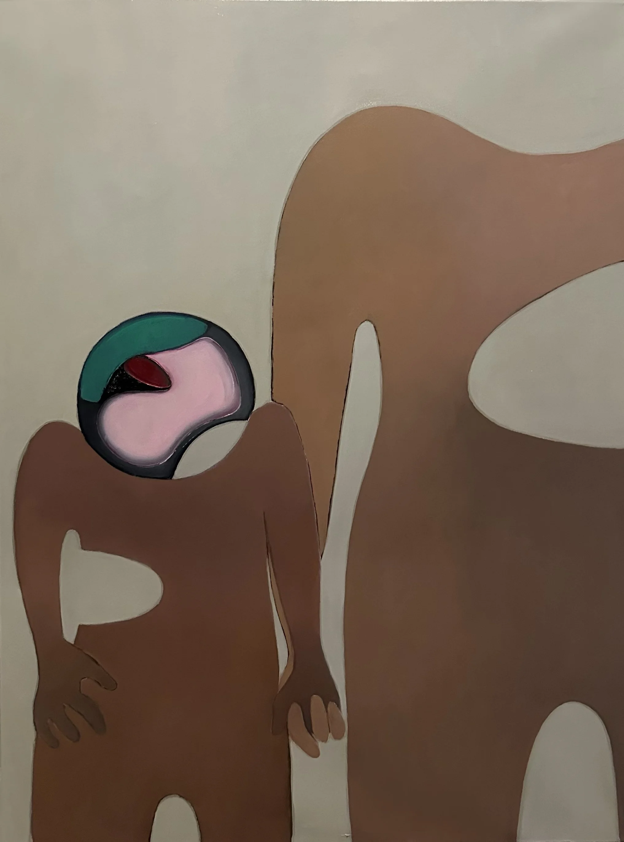 This painting portrays a father and child in war. The father’s figure stands as a shield, while the child appears fragile and helpless. Brown symbolizes earth and resilience, while the gray-white background conveys desolation.